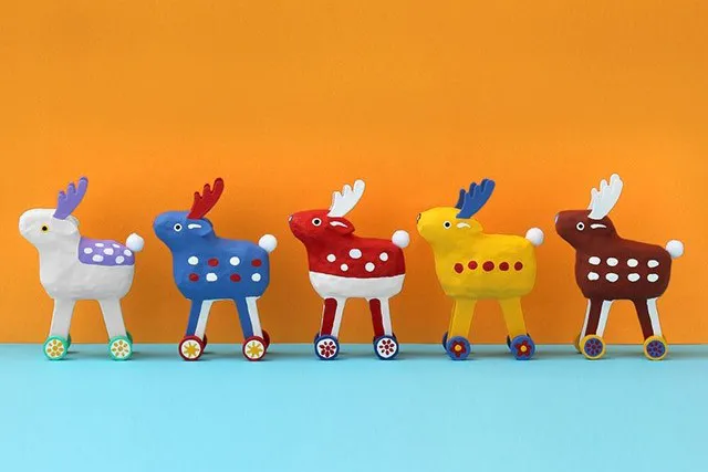 手掌大小的一只黃色小鹿,紅色斑點(diǎn),藍(lán)色鹿角,腳踩溜冰鞋,出自中川政七商店「新鄉(xiāng)土玩具」系列——以創(chuàng)造“從今天到百年后仍留存的鄉(xiāng)土玩具”為宗旨,重新設(shè)計(jì)制作日本各地手作玩具,使其在現(xiàn)代生活重?zé)ü獠省?o:p>