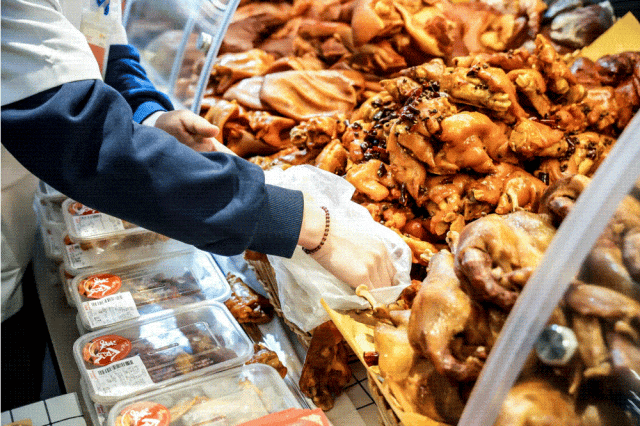 熟食也是本次煥新的重點。品種上,既有全國統(tǒng)一的推動,如煌上煌品牌鹵味,自制烤雞、爆款牛肉條、小香腸等;也有各種地方特色及現(xiàn)場燉煮等,如鹽水鴨、荷葉雞等,豐富的品種,誘人的色澤,騰騰的熱氣及怡人的香氣,具象化地詮釋了什么是人間煙火。