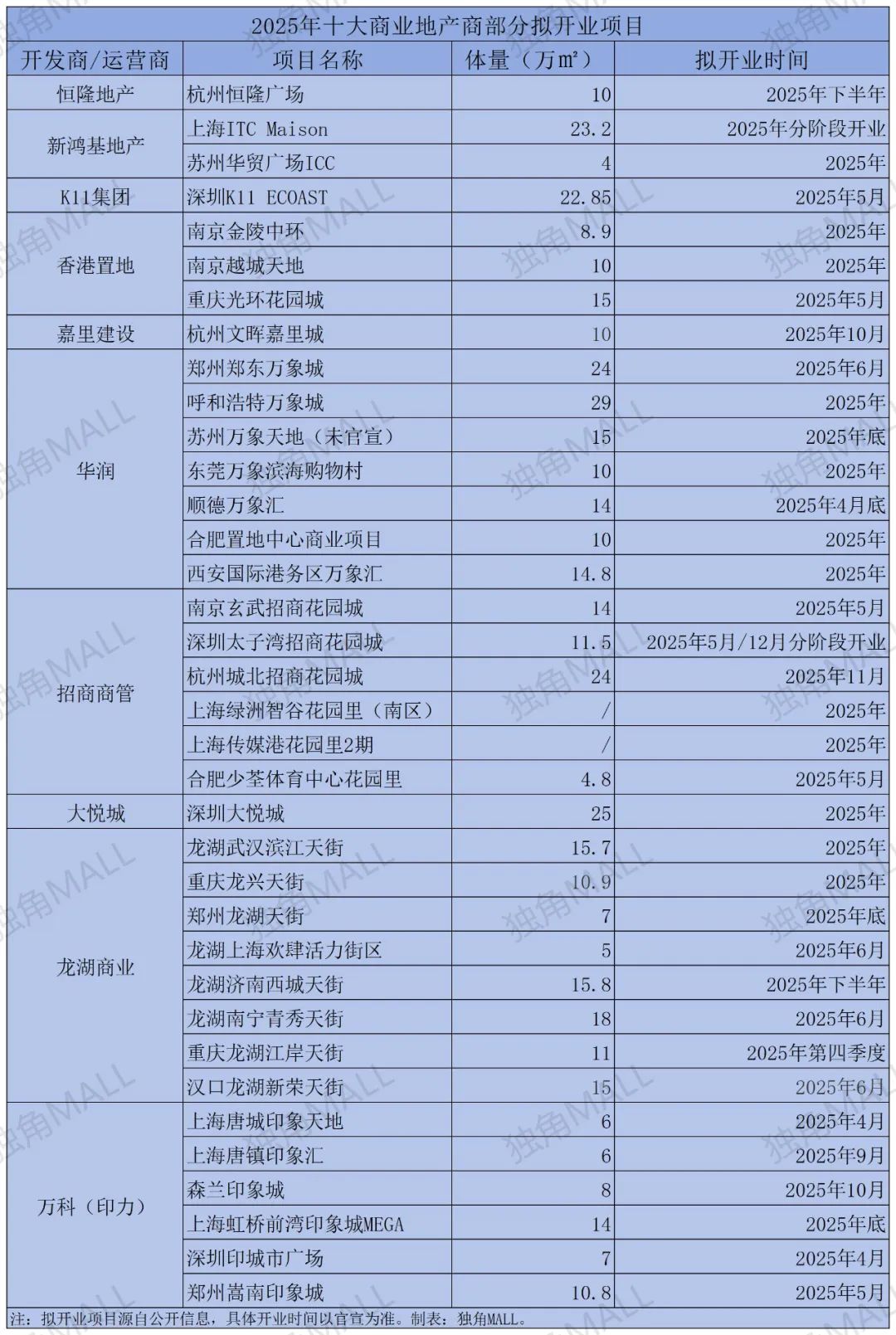 2025年即將到來,獨(dú)角Mall不完全統(tǒng)計(jì)了恒隆集團(tuán)、新鴻基地產(chǎn)、K11集團(tuán)、香港置地、嘉里建設(shè)、華潤、招商商管、龍湖商業(yè)、大悅城、萬科(印力)等10家商業(yè)地產(chǎn)商將開的36個(gè)重點(diǎn)商業(yè)項(xiàng)目,商業(yè)體量超435萬平方米。