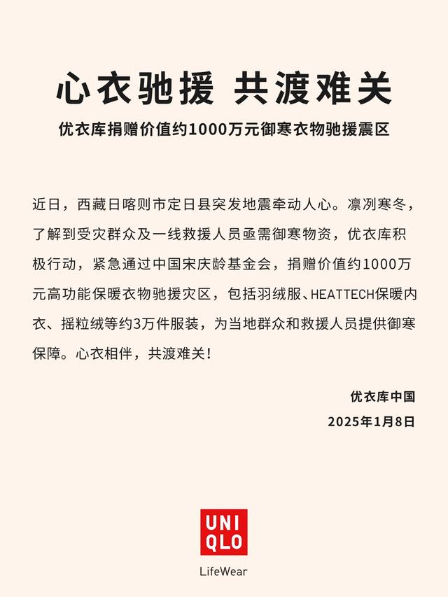 優(yōu)衣庫(kù)捐贈(zèng)價(jià)值約1000萬(wàn)元御寒衣物馳援西藏震區(qū)