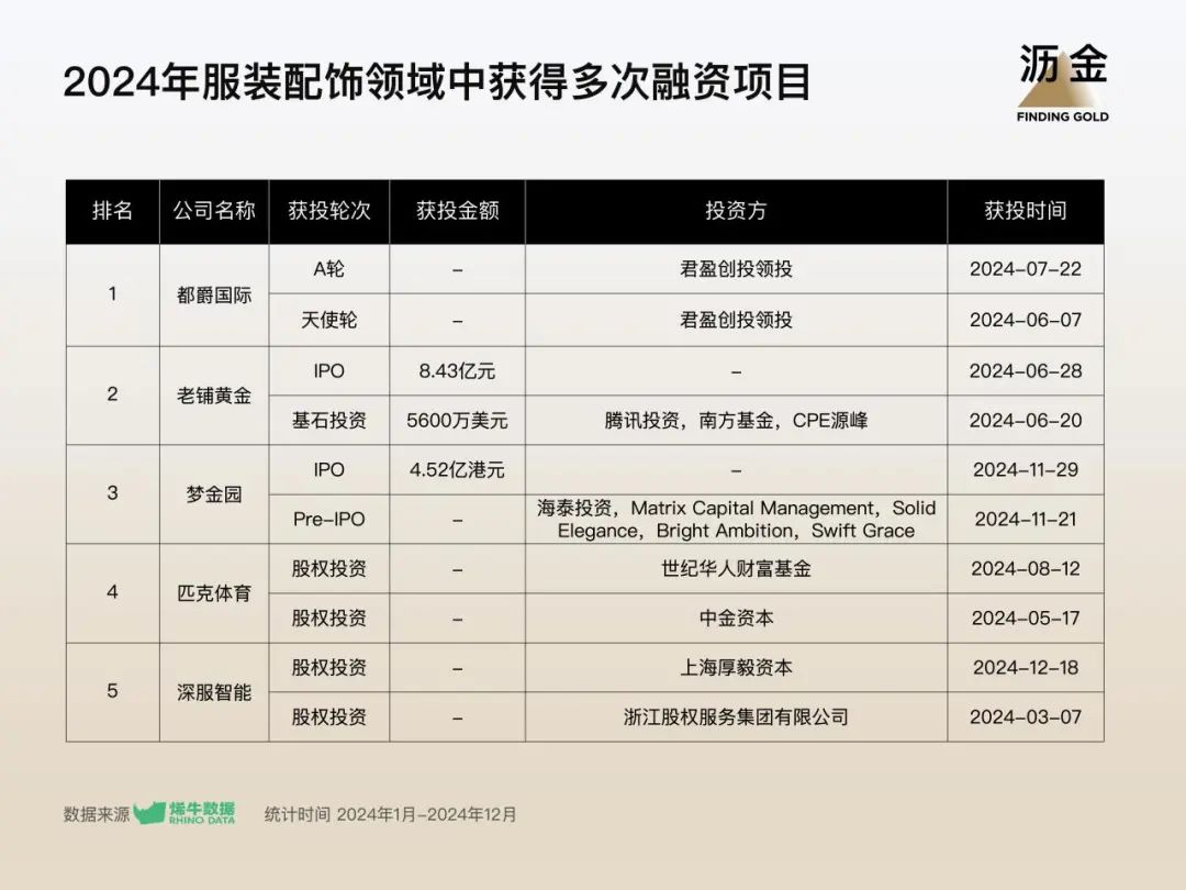 2024年,共有5家企業(yè)獲得多輪融資,黃金依然是熱門吸金賽道,老鋪黃金、夢金園均收獲多輪融資。