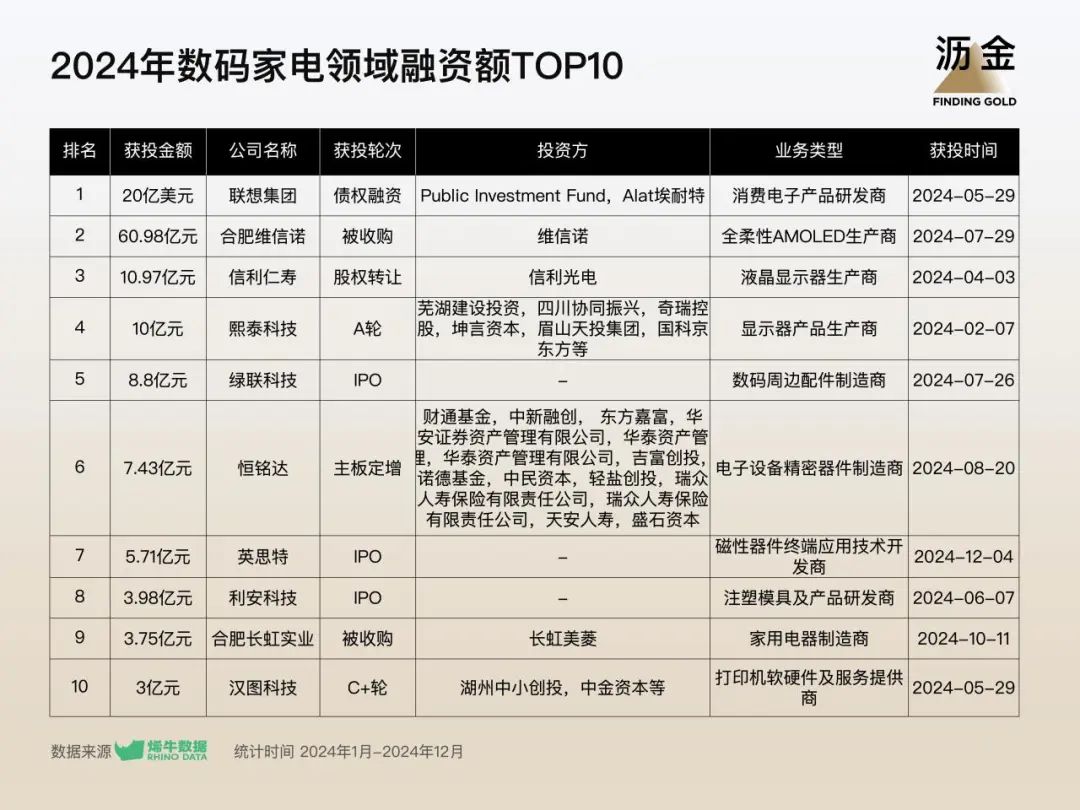 數(shù)碼家電領(lǐng)域融資額TOP10