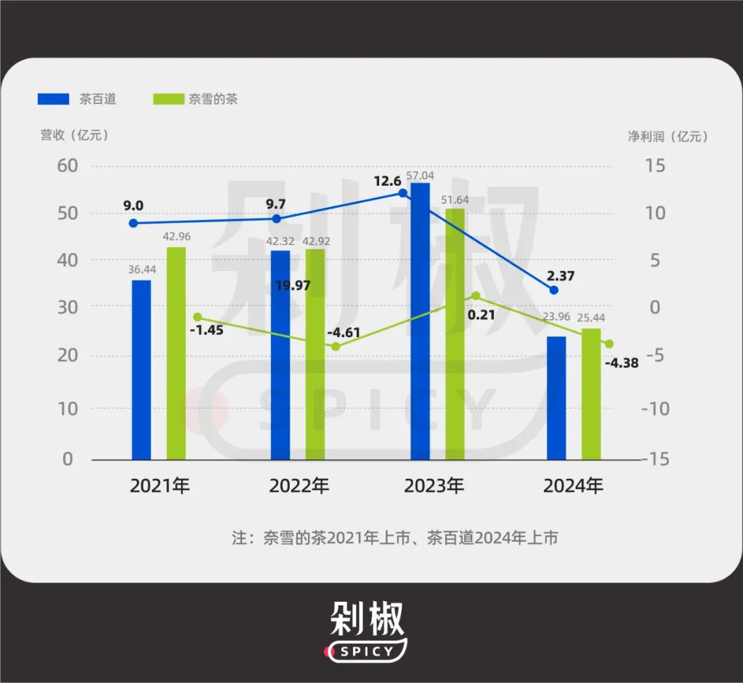 奈雪的茶經(jīng)營(yíng)狀況堪憂,上市三年來(lái)營(yíng)收表現(xiàn)一直不佳。在2024年上半年財(cái)報(bào)中,奈雪營(yíng)收為25.44億元,同比下滑1.9%,虧損高達(dá)4.38億。被冠以 “新茶飲第二股” 之名的茶百道,同樣深陷困境。上半年經(jīng)歸母凈利潤(rùn)2.37億元,凈利潤(rùn)的下滑幅度更是達(dá)到60%,這份公司上市以來(lái)首次向市場(chǎng)交出的 “答卷”,在短短幾個(gè)月內(nèi)就遭遇 “業(yè)績(jī)變臉” ,營(yíng)收與利潤(rùn)雙雙遭遇重創(chuàng)。