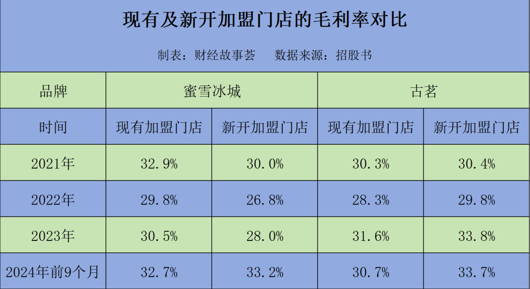 與此同時,蜜雪冰城新開設門店的毛利率長期低于原有加盟店的毛利率。2023年之前,兩者相差2-3%,直到2024年上半年,新開設加盟門店才完成“逆襲”,比原有加盟店的毛利率微高出0.5%。