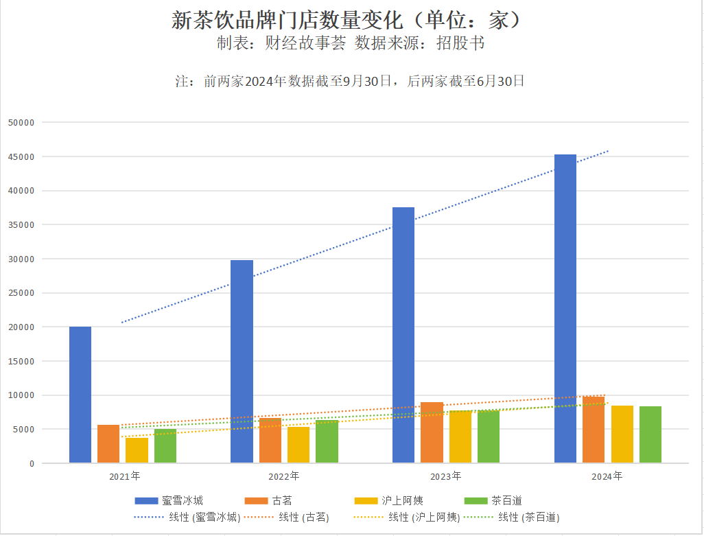 成立前10年,蜜雪冰城只開了1家店,從1000家到10000家,蜜雪冰城花了6年時間,再從萬家門店增長到20000家,僅僅耗時兩年。2024年,蜜雪冰城首次在港股申請IPO時,門店規(guī)模是36153家。今年元旦,蜜雪冰城給出的數(shù)據(jù)變成了45282家,而在同一賽道上,截至2024年前9個月,排在第二的古茗門店也沒到萬家。