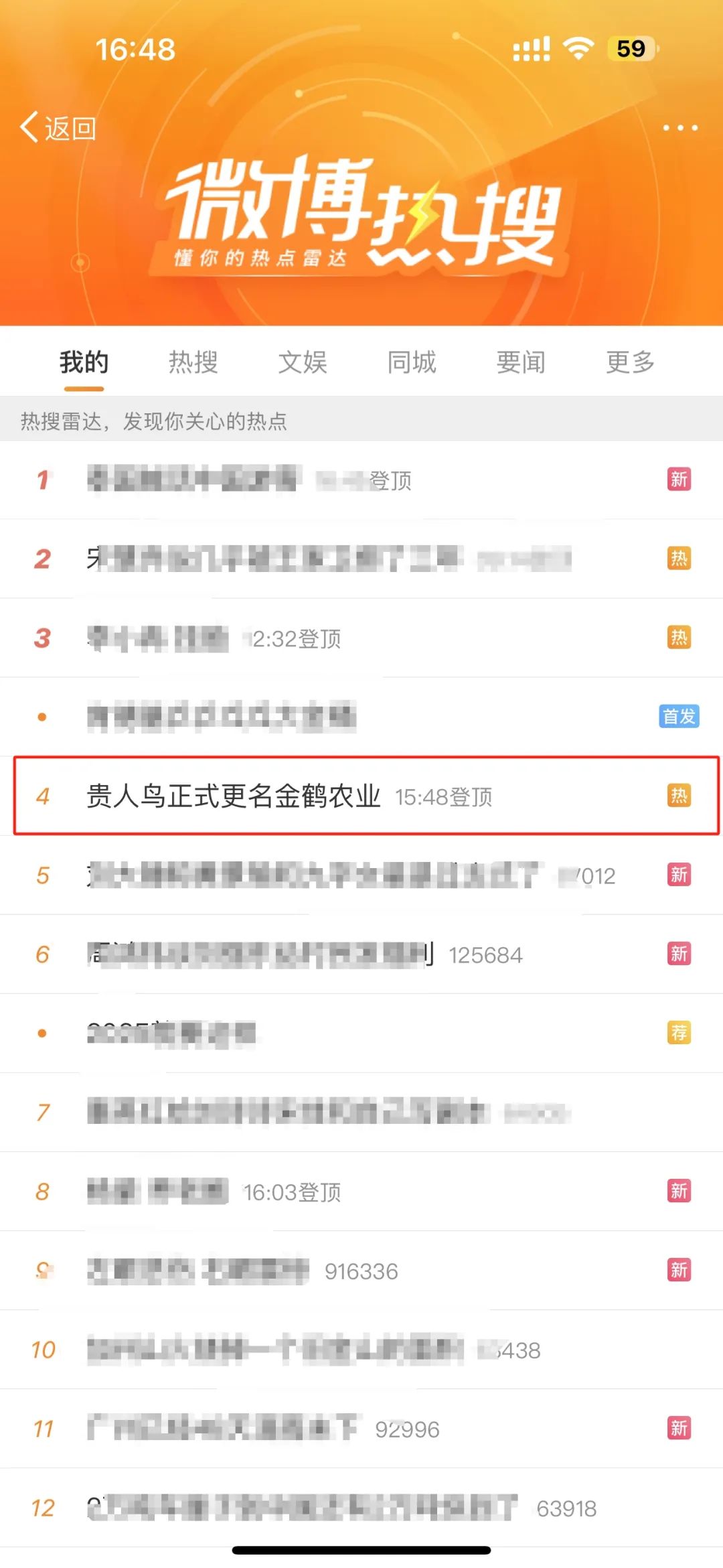 1月13日下午15:48,一則名為“貴人鳥正式更名為金鶴農(nóng)業(yè)”的話題在微博熱搜登頂。