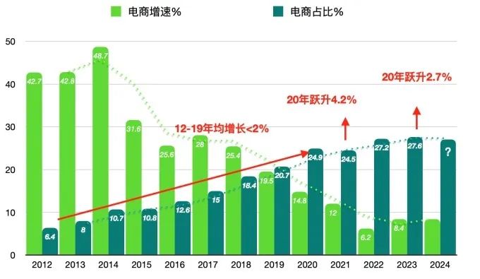 圖2 2012-2024國內(nèi)電商占比和增速走勢圖(2024待最后公布) 來源:根據(jù)國家統(tǒng)計局網(wǎng)站發(fā)布數(shù)據(jù)繪制