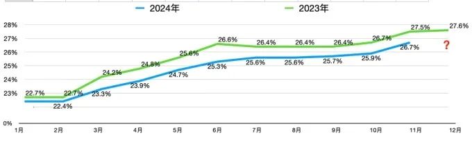 由圖1可見,藍色為2024年1月-11月的電商占比,綠色為2023年1月-12月的電商占比。很顯然,2024年的電商增長顯然均低于2023年的同期水準。是不是國內(nèi)電商占比停止增長了?答案是肯定的。其實這是好現(xiàn)象,說明國內(nèi)社會品消費零售總額的質(zhì)量在提升。