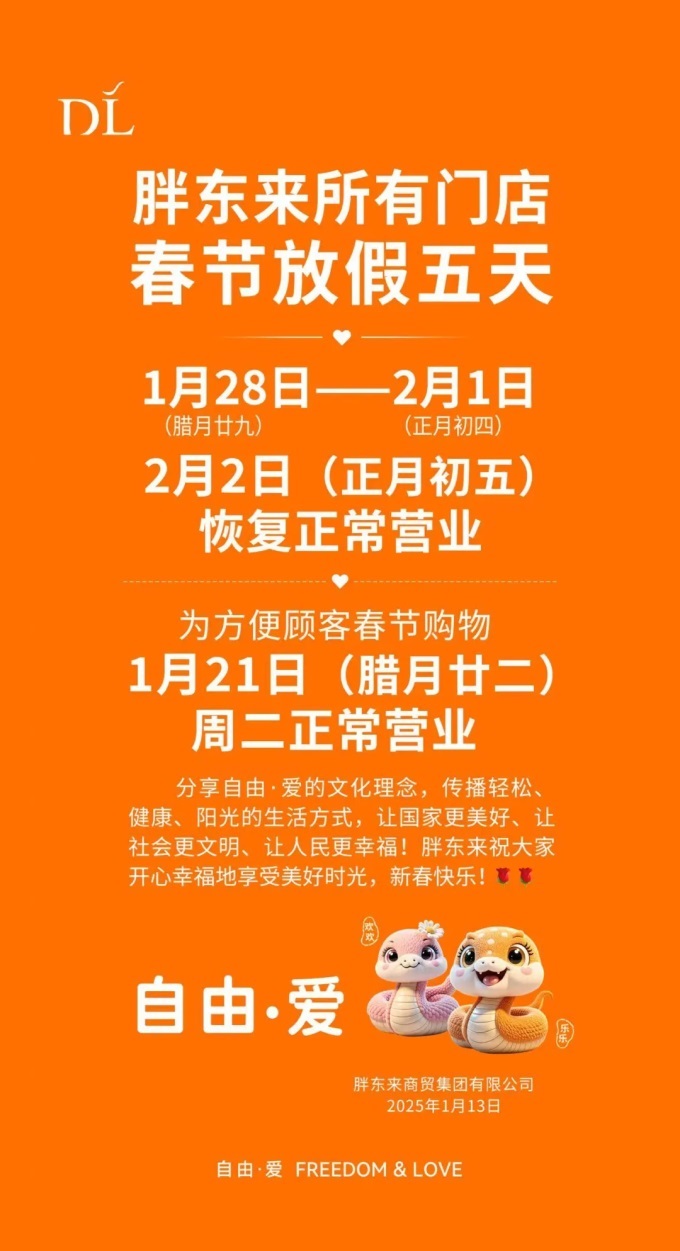 1月13日,胖東來商貿(mào)集團公告,1月28日(農(nóng)歷臘月廿九)至2月1日(農(nóng)歷正月初四),所有門店春節(jié)放假五天,2月2日(農(nóng)歷正月初五)恢復正常營業(yè)。同時,為方便顧客春節(jié)購物,1月21日(農(nóng)歷臘月廿二)當日取消“周二閉店”,正常營業(yè)。