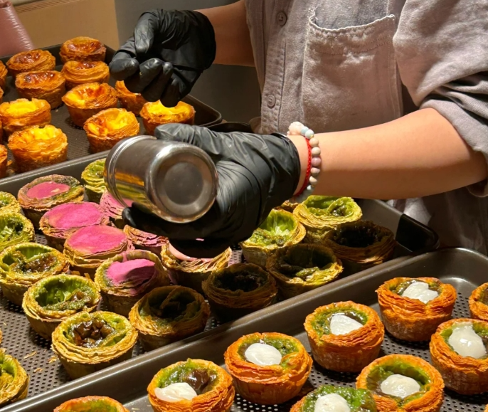 比如蛋撻專門店,在烤好的蛋撻上堆放各種餡料,包括不限于各種水果塊、黑糖珍珠、抹茶、榴蓮、芋泥、麻薯等,以此來(lái)吸引消費(fèi)者。
