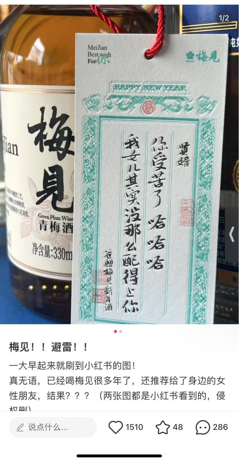 近日,網(wǎng)上出現(xiàn)了多條梅見的避雷帖。據(jù)網(wǎng)友發(fā)布的帖子,梅見的新年包裝上,寫著“賢婿,你受苦了,哈哈哈,我女兒其實沒那么配得上你。爸贈梅見新年酒”、“姐們兒,祝你新一年兜里的錢像男人一樣夠花”、“鄭重聲明,每次媽媽說你的時候,我沒有附和哦”等文字。
