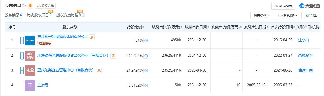 通過營銷在市場站穩(wěn)腳跟,梅見的打法與當年的江小白幾乎如出一轍,事實上,梅見與江小白確實存在著千絲萬縷的聯(lián)系。天眼查顯示,梅見背后是重慶江記酒莊有限公司,2019年至今,已獲得了來自高瓴資本、華信集團、信達匯融的三輪融資,融資金額超過10億元。而該公司的控股股東,為持股51%的重慶瓶子星球酒業(yè)集團有限公司。