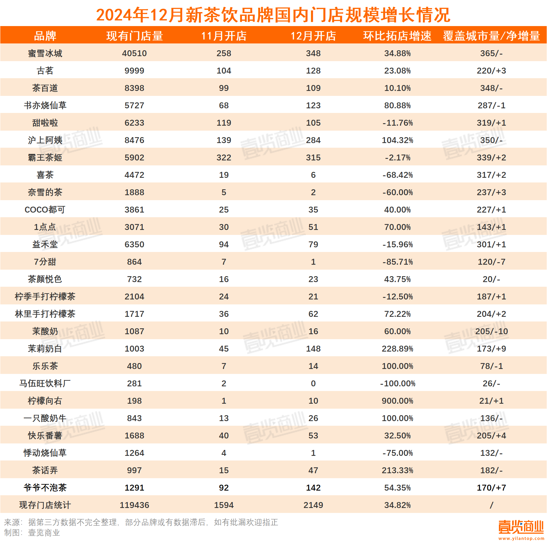 從整體開店數(shù)量來看,國內(nèi)26家連鎖茶飲品牌一共新開門店2149間,現(xiàn)存門店一共107525間。在10月、11月連續(xù)的新開門店數(shù)減少后,新茶飲行業(yè)的擴(kuò)張增速終于觸底反彈,12月的新開門店量重歸正增長。