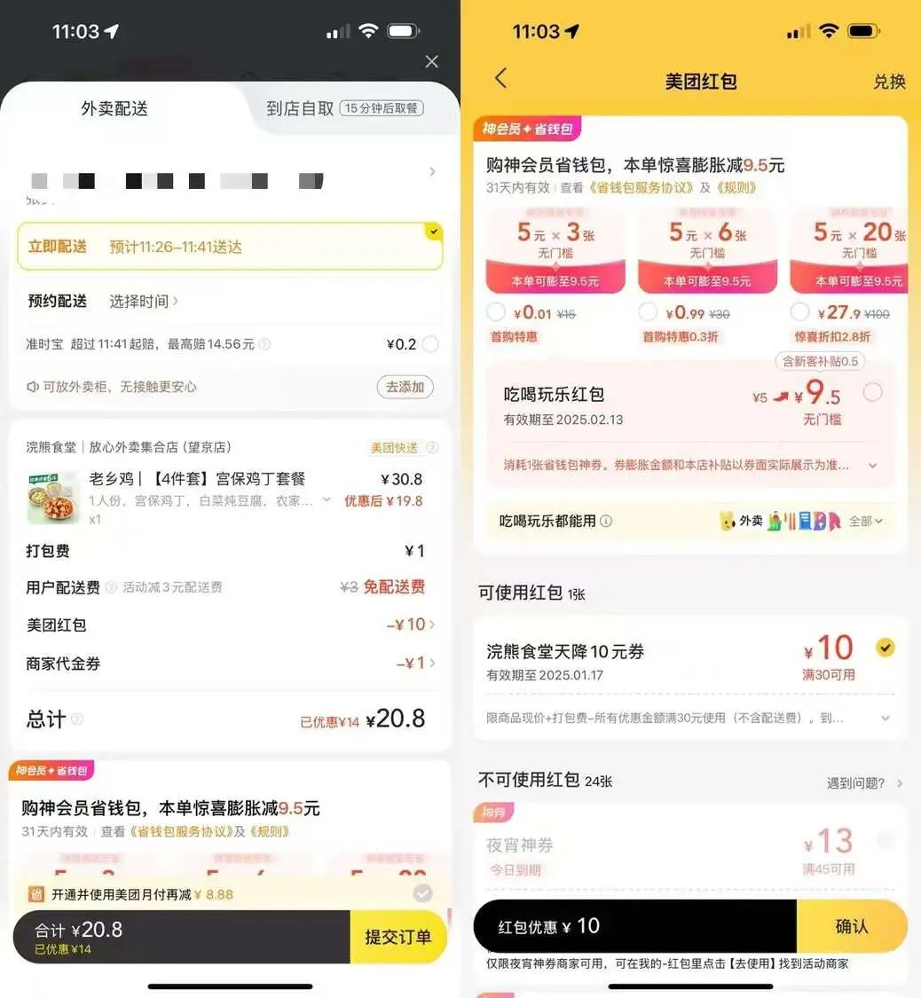 圖注:左為浣熊食堂外賣支付界面,右為美團外賣支付界面。