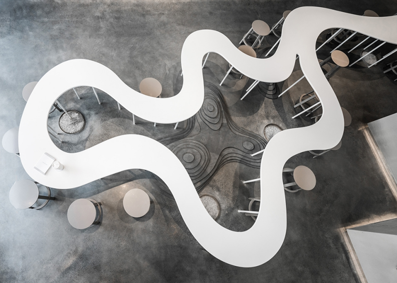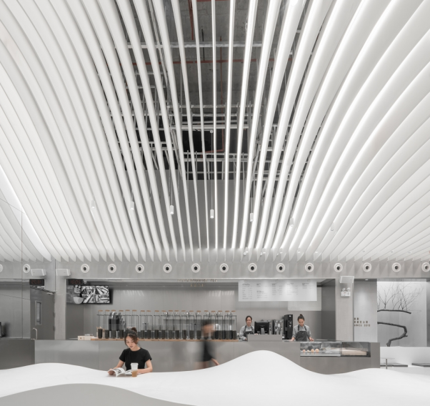 深圳深業(yè)上城DP店「山溪間·找茶趣」就在王羲之的《蘭亭集序》中汲取靈感,將古人圍溪而坐品茗暢談的茶事場(chǎng)景搬進(jìn)喜茶空間,還原“流觴曲水”的中式意境;而廣州凱華國(guó)際DP店以「山外山」為題,摒棄了普通茶飲空間散落的空間布局,以一張貫穿門(mén)店的長(zhǎng)桌將茶客們聚合,不規(guī)則隆起形似山巒的桌面又將茶客分隔,形式上近似東方意象中的層云疊嶂,置身其中如同身處宋代畫(huà)家米芾《春山瑞松圖》所描繪的云間茶山,中國(guó)古典山水的禪意與現(xiàn)代茶事交融其間。