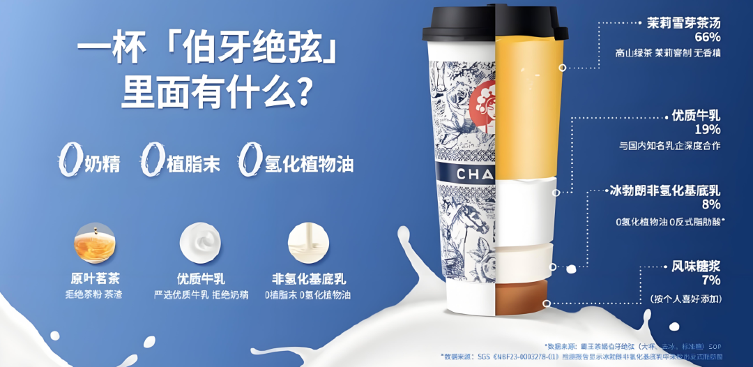畢竟,對于消費者而言,無論是霸王茶姬過往的“低GI”標識、將“伯牙絕弦”等明星產(chǎn)品的配方和成分比例對外進行公開,以及推進 “0奶精、0植脂末、0氫化植物油”等動作,都成功的在消費者心智中塑造了品牌“健康”的標識。