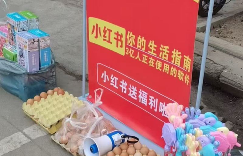 用戶規(guī)模增速放緩的小紅書,一方面開始在虎撲等“直男社區(qū)”打廣告,吸引男性用戶,一面在2024年開始了更接地氣的推廣行為,通過在線下送雞蛋等方式,吸引中老年用戶群體。