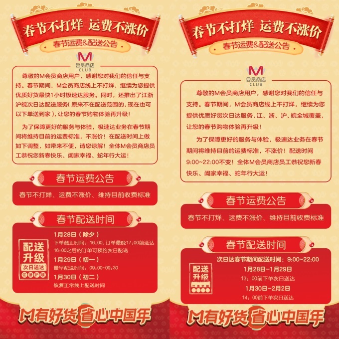 M會(huì)員店宣布,春節(jié)線上線下不打烊,并承諾運(yùn)費(fèi)不漲價(jià),繼續(xù)為會(huì)員提供全渠道優(yōu)質(zhì)服務(wù),春節(jié)期間堅(jiān)守崗位的配送員春節(jié)加班補(bǔ)貼由公司承擔(dān)。