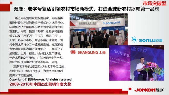 對(duì)于市場(chǎng)突破型的代表,錦坤一直深度輔導(dǎo)和服務(wù)的雙鹿是典范,她通過老字號(hào)復(fù)活引領(lǐng)農(nóng)村市場(chǎng)新模式,打造全球新農(nóng)村冰箱第一品牌,并且在品牌出海中表現(xiàn)優(yōu)異。