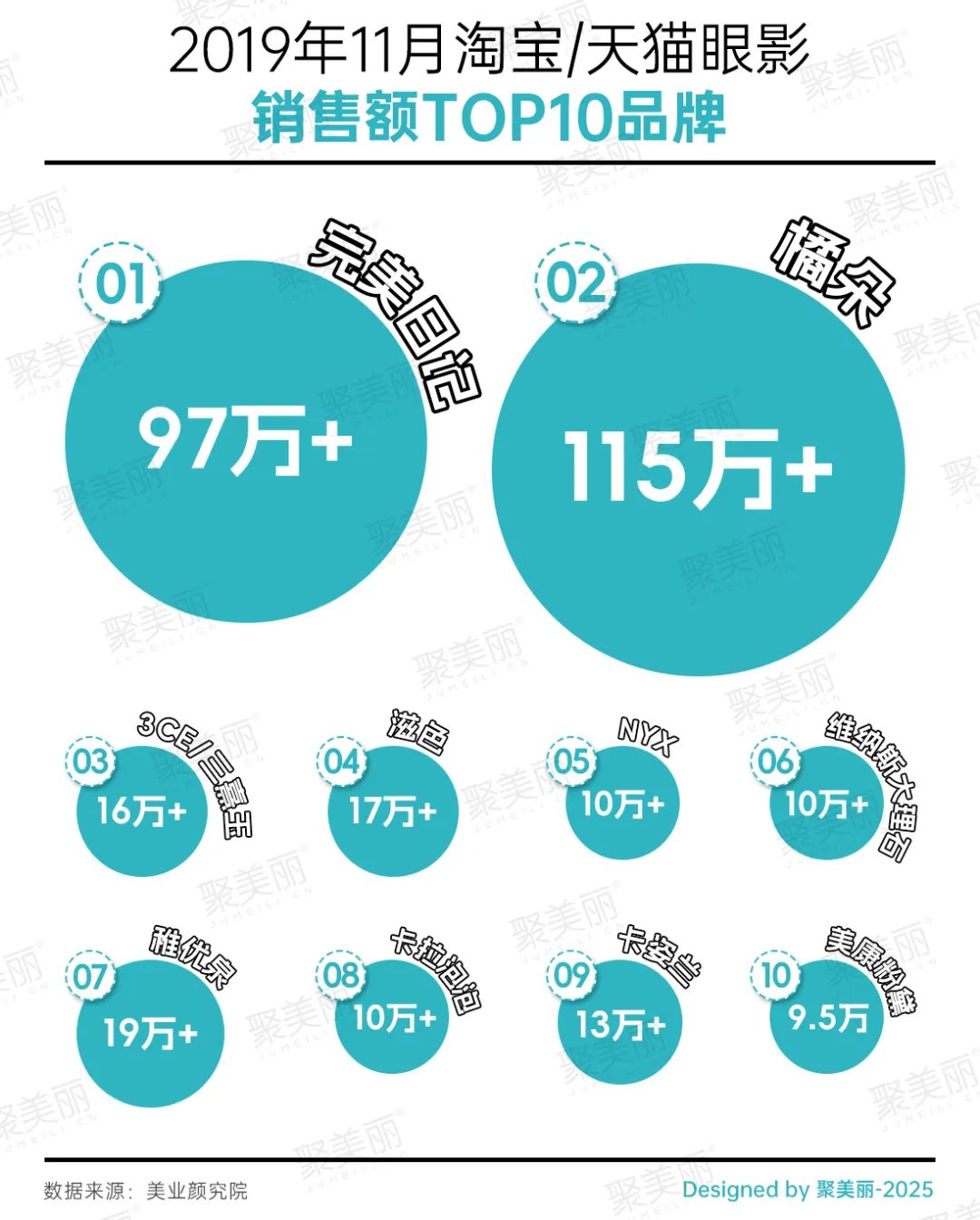 美業(yè)顏究院數(shù)據(jù)顯示,2019年11月淘寶/天貓眼影銷售額TOP10品牌中,VENUS MARBLE大理石盤銷售額下滑到第六名,而在該年完美日記沖到了該榜第一。