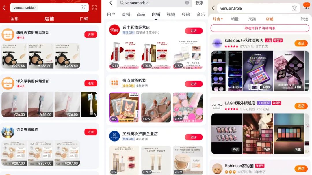 基于上述信息,聚美麗記者也對閉店消息進一步求證,在京東、抖音、天貓上搜索VENUS MARBLE官方旗艦店均顯示不見,僅有部分C店在售賣其產品。