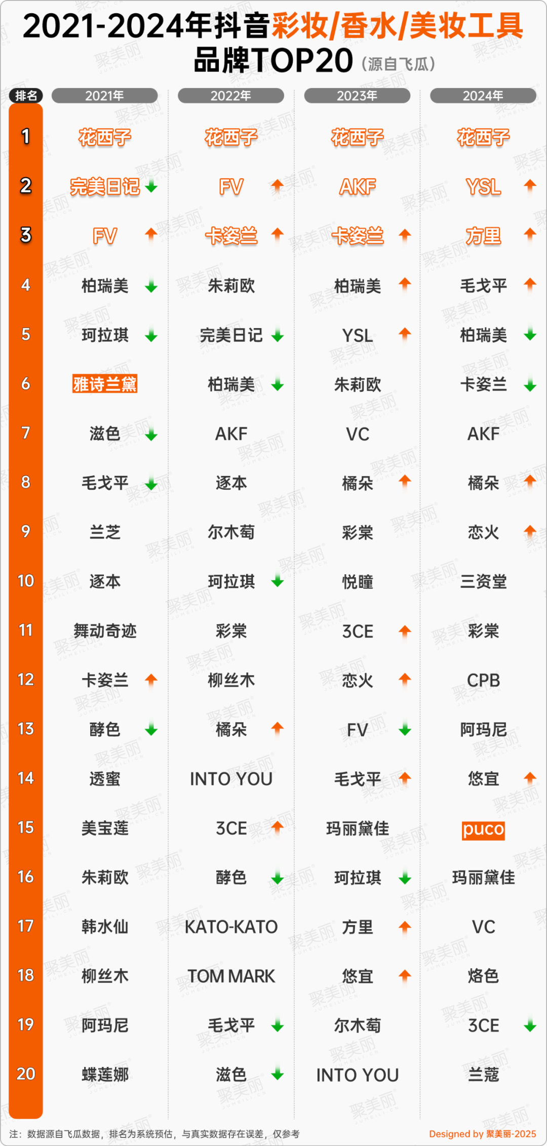 其余新國貨彩妝品牌中,方里成為年度黑馬,位列去年抖音彩妝/香水/美妝工具類目榜單第三名;橘朵、戀火、悠宜等則排名上升,柏瑞美則略微下降一個位次,AKF重回榜單第7。