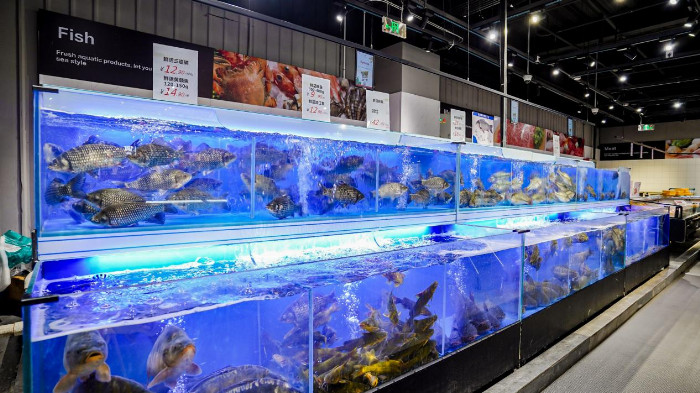 品類布局方面,生鮮品類由之前的聚在一起,改為占據(jù)了整個(gè)賣場主通道右側(cè)靠墻的區(qū)域,占比也由原來的35%增加到超過50%,從入口處的壽司、烘焙、熟食到蔬菜、水果、肉類、水產(chǎn)、雜糧干貨等,貫穿整個(gè)賣場主動(dòng)線。