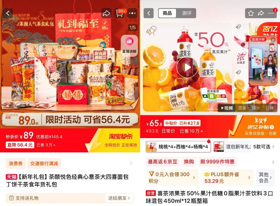 鋅刻度從天貓、京東等電商平臺看到,喜茶12瓶裝濃果茶年貨禮盒和12瓶裝輕果茶年貨禮盒售價分別65.8元和47.5元,多平臺累積銷量超過15萬份;茶顏悅色人氣茶食年貨禮盒售價89元,銷量超過5萬份。