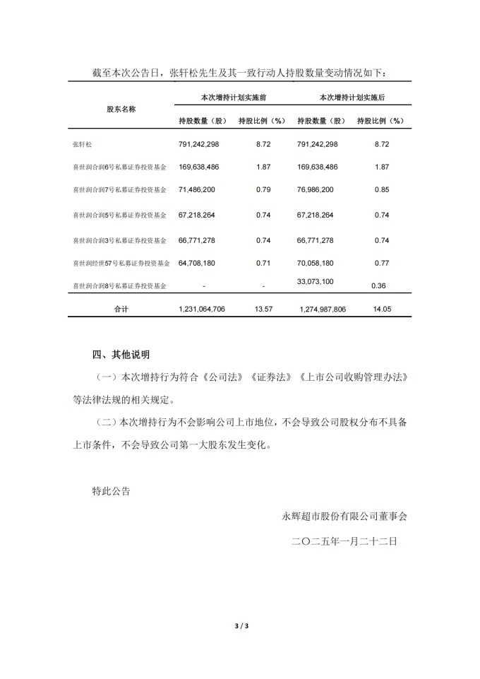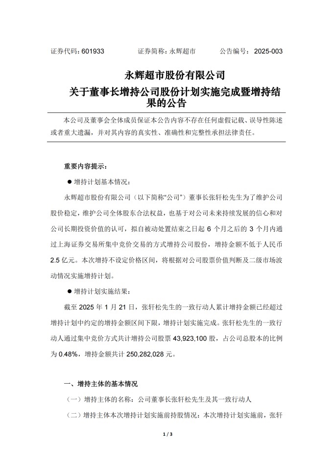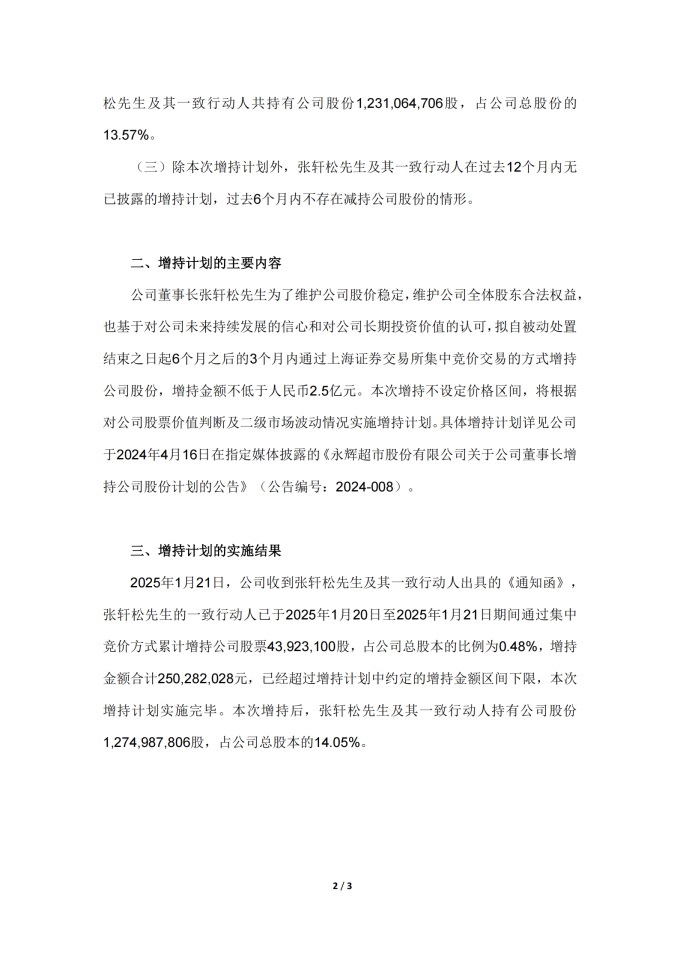 1月21日,永輝超市根據證券法及上市公司相關管理規(guī)定,發(fā)布了《永輝超市股份有限公司關于5%以上股東權益變動觸及1%的提示性公告》及《永輝超市股份有限公司關于董事長增持公司股份計劃實施完成暨增持結果的公告》兩份公告,共同披露了董事長張軒松的一致行動人對永輝股票的增持行為。