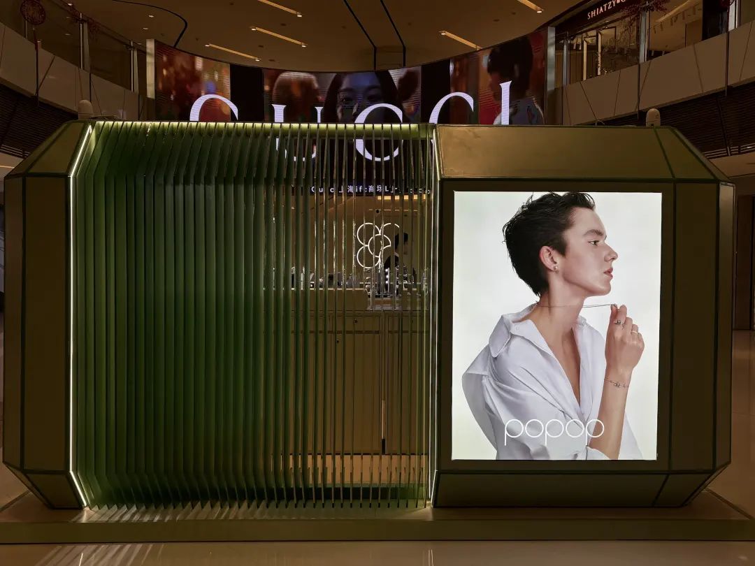 這家名為“POPOP”的開放式快閃空間,是泡泡瑪特正式推出珠寶品牌后開出的前兩家線下店之一。走近,會(huì)看到店內(nèi)三三兩兩的顧客正在挑選試戴,還有一位嚴(yán)肅的黑衣安保人員立在門口——或許是考慮到POPOP的“珠寶”屬性,也或許是泡泡瑪特近一年來的全方位爆火難免讓人擔(dān)憂客流量過高,IFC為這家店提供了免費(fèi)的單獨(dú)安保。