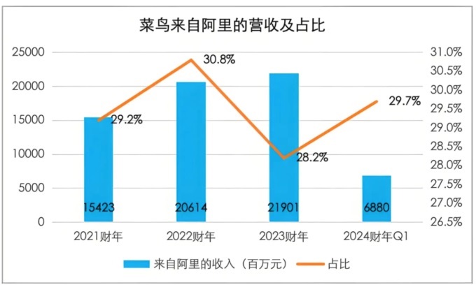 事實(shí)上,據(jù)菜鳥(niǎo)此前披露的招股書,2021至2023財(cái)年來(lái)自阿里的收入占比基本穩(wěn)定在三成左右,還有70%來(lái)自于外部客戶。