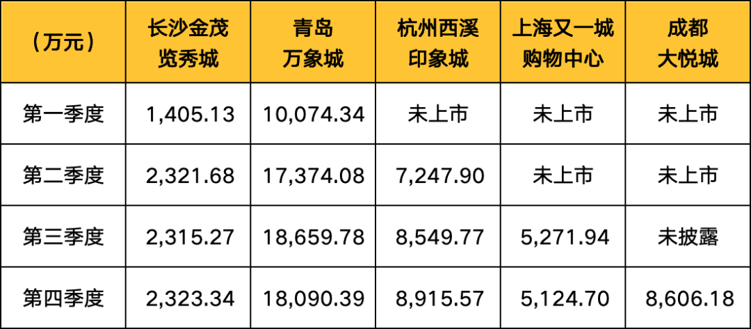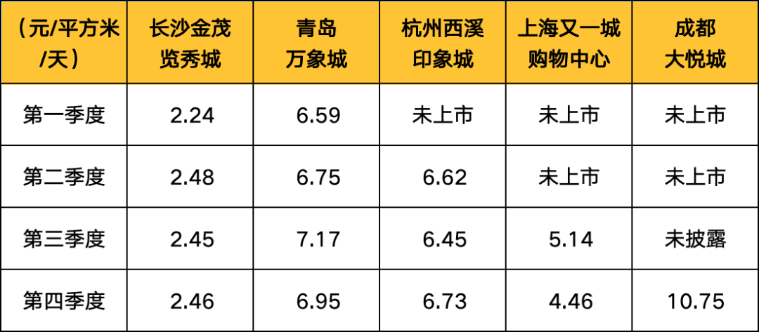 從已披露項目的平均租金來看,基數(shù)較低的長沙金茂覽秀城保持了逐季度的穩(wěn)步增長,杭州西溪印象城四季度平均租金則略有下滑。