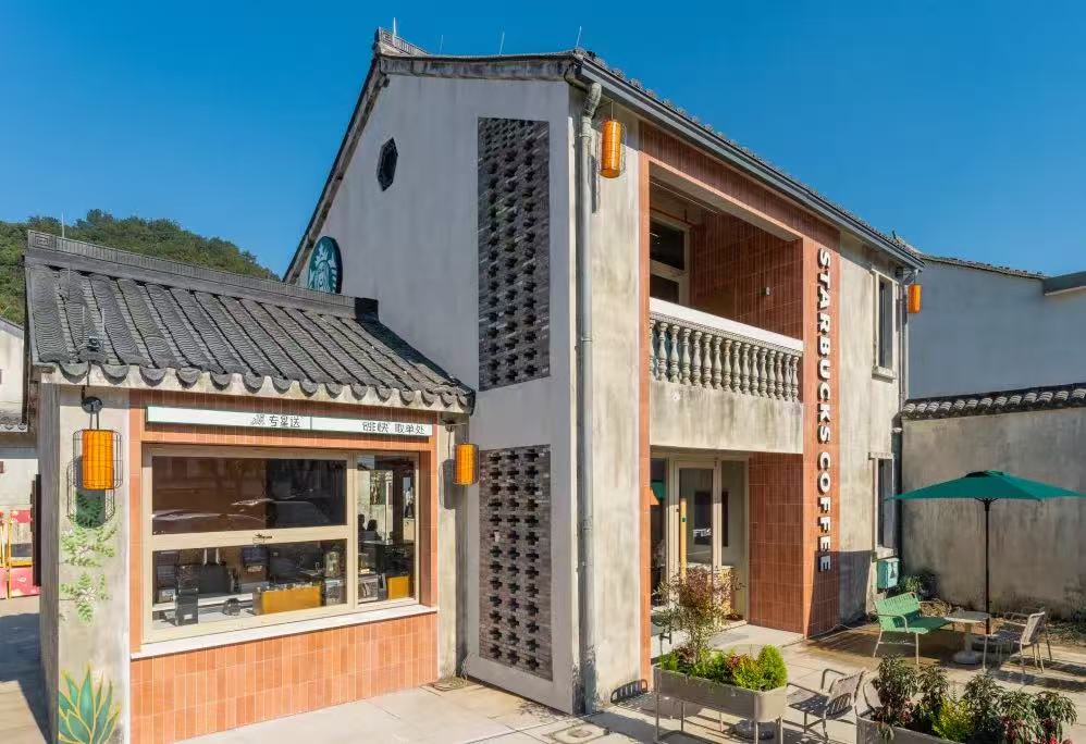 上周,星巴克就在普陀山景區(qū)內(nèi)開了一家新店,這家門店是仿古風格,外立面采用硬山頂形式搭建仿古屋檐,瓦片和灰色三扇屏風隔出墻面,貼上復古的招牌以及經(jīng)典的美人魚標志,內(nèi)部屏風元素隨處可見,梁體結(jié)構(gòu)采用胡桃木飾面。從遠處看,這家門店更像是一座古代的客棧,而非現(xiàn)代的咖啡廳。