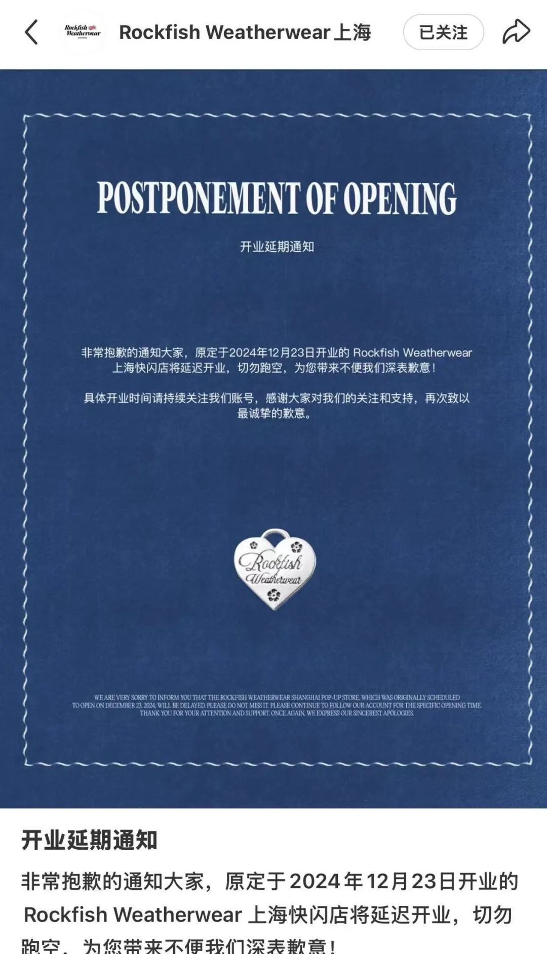 去年12月,Rockfish Weatherwear上海小紅書官方賬號(hào)宣布,其品牌快閃店,即將來(lái)到上海。不過(guò)之后,該賬號(hào)發(fā)布消息稱,原定于2024年12月23日開(kāi)業(yè)的上海快閃店,將延遲亮相。