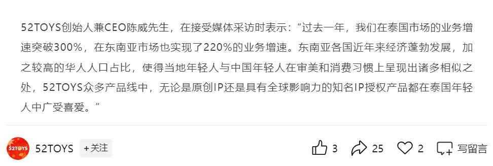 52TOYS將東南亞視為重要市場,一方面是因為東南亞玩具游戲市場潛力較大。有數(shù)據(jù)顯示,2023年,東南亞玩具游戲市場規(guī)模為56.4億美元,預(yù)計2028年將增長到65.2億美元,年增速為7%。另一方面,東南亞與我國文化消費習(xí)慣相似,為潮玩品牌出海提供了優(yōu)勢。