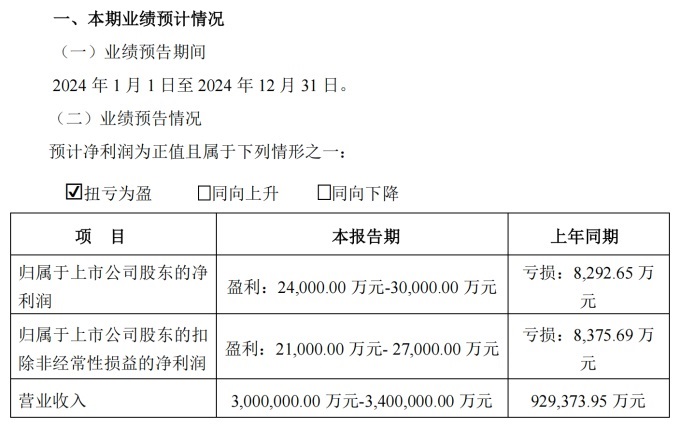 經(jīng)公司財(cái)務(wù)部門初步核算,萬辰集團(tuán)預(yù)計(jì)2024年實(shí)現(xiàn)營收300億元至340億元,上年同期為92.94億元;實(shí)現(xiàn)歸屬凈利潤2.4億元至3億元,上年同期為虧損8292.65萬元;預(yù)計(jì)實(shí)現(xiàn)扣非凈利潤2.1億元至2.7億元,上年同期為虧損8375.69萬元。