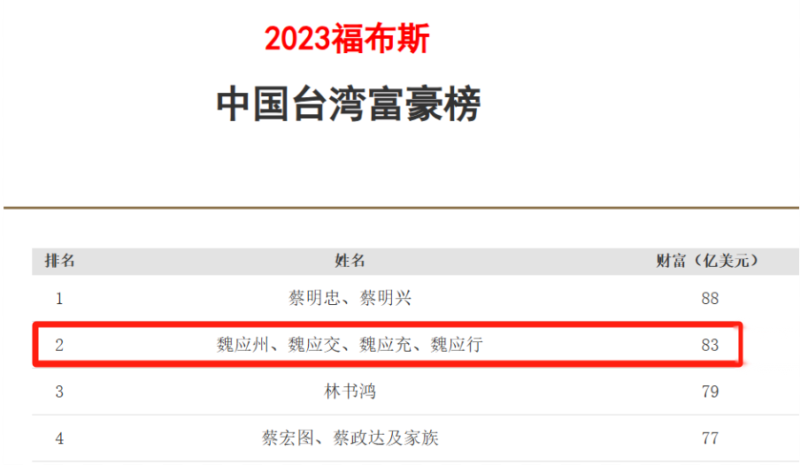 在大陸的食品生意風(fēng)生水起,魏氏四兄弟的身家也跟著水漲船高。2023年,魏氏四兄弟以83億美元(約合600億人民幣)的身家,穩(wěn)坐中國臺灣富豪寶座。