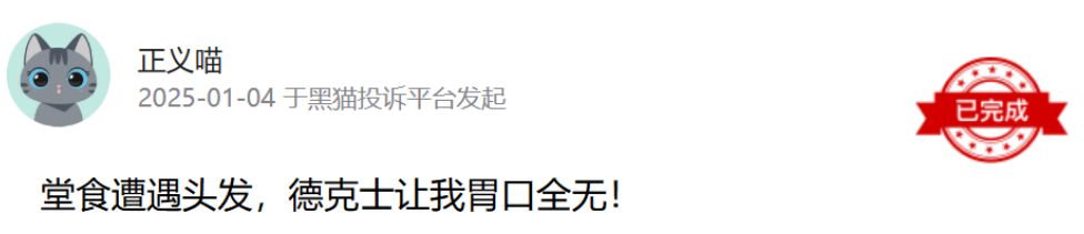 黑貓投訴平臺上,德克士的投訴量高達1322條,顧客們的抱怨集中在食品質(zhì)量差、外賣送餐超時、取消訂單不退款、客服態(tài)度差,甚至有人吃出雞毛、頭發(fā)等異物。
