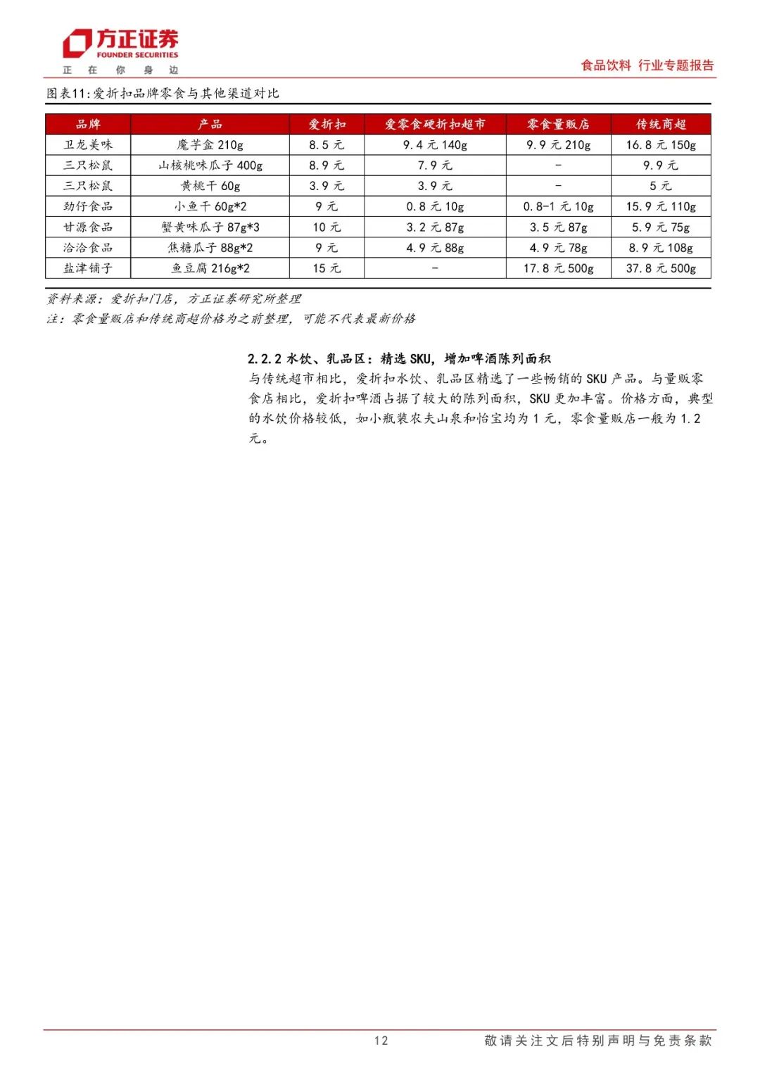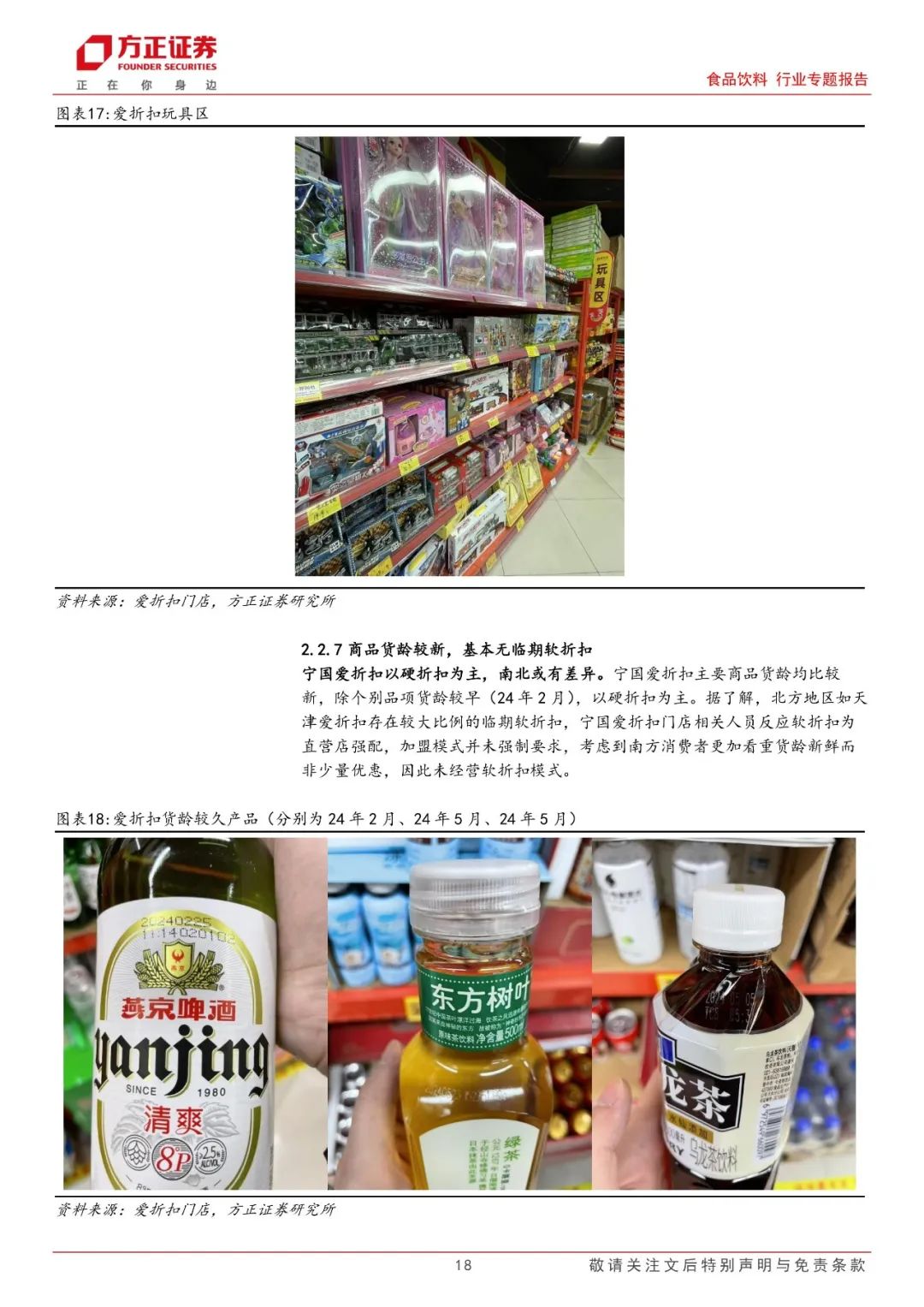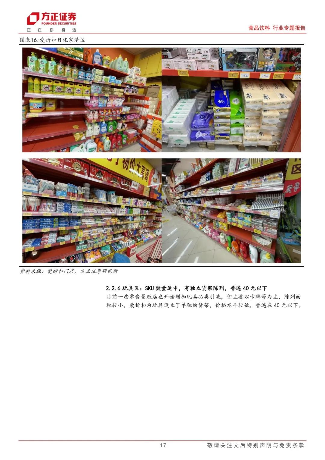 貨盤及價(jià)格梳理:零食水飲具備價(jià)格優(yōu)勢(shì),逐漸構(gòu)造更多品類優(yōu)勢(shì)。①零食:定量裝為主,性價(jià)比高,價(jià)格略低于零食量販店(愛(ài)折扣許多商品多件購(gòu)買有優(yōu)惠),顯著低于傳統(tǒng)商超。②水飲、乳品區(qū):與傳統(tǒng)超市相比,水飲、乳品區(qū)精選了一些暢銷的SKU產(chǎn)品。與零食量販店相比啤酒陳列面積更大,SKU更加豐富。典型的水飲價(jià)格較低,如小瓶裝農(nóng)夫山泉和怡寶均為1元,零食量販店一般為1.2元。③米面糧油調(diào)味品:優(yōu)選頭部品牌商品,SKU有所精簡(jiǎn)。④凍品區(qū):大牌為主,SKU豐富。⑤日化家清:精選暢銷款,價(jià)格水平與傳統(tǒng)超市相比更低。⑥玩具區(qū):擁有獨(dú)立陳列貨架,SKU數(shù)量適中。⑦商品貨齡較新,以硬折扣為主。