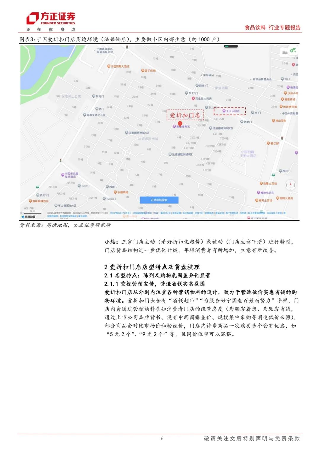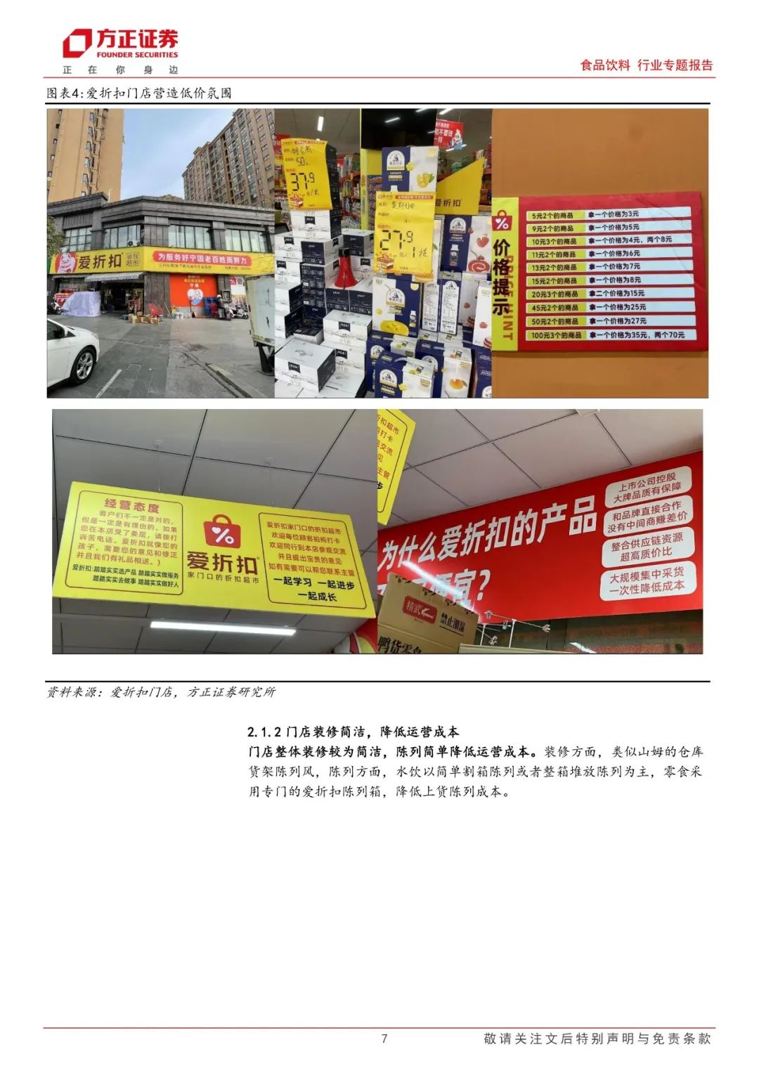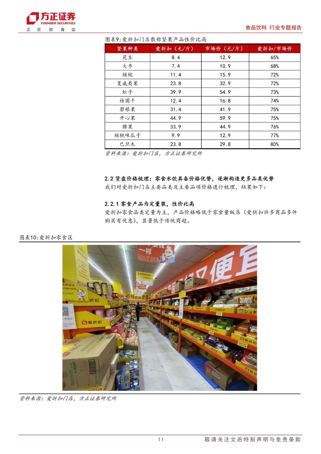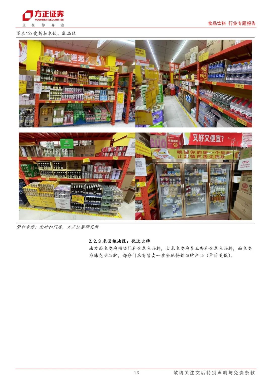 貨盤及價(jià)格梳理:零食水飲具備價(jià)格優(yōu)勢(shì),逐漸構(gòu)造更多品類優(yōu)勢(shì)。①零食:定量裝為主,性價(jià)比高,價(jià)格略低于零食量販店(愛(ài)折扣許多商品多件購(gòu)買有優(yōu)惠),顯著低于傳統(tǒng)商超。②水飲、乳品區(qū):與傳統(tǒng)超市相比,水飲、乳品區(qū)精選了一些暢銷的SKU產(chǎn)品。與零食量販店相比啤酒陳列面積更大,SKU更加豐富。典型的水飲價(jià)格較低,如小瓶裝農(nóng)夫山泉和怡寶均為1元,零食量販店一般為1.2元。③米面糧油調(diào)味品:優(yōu)選頭部品牌商品,SKU有所精簡(jiǎn)。④凍品區(qū):大牌為主,SKU豐富。⑤日化家清:精選暢銷款,價(jià)格水平與傳統(tǒng)超市相比更低。⑥玩具區(qū):擁有獨(dú)立陳列貨架,SKU數(shù)量適中。⑦商品貨齡較新,以硬折扣為主。