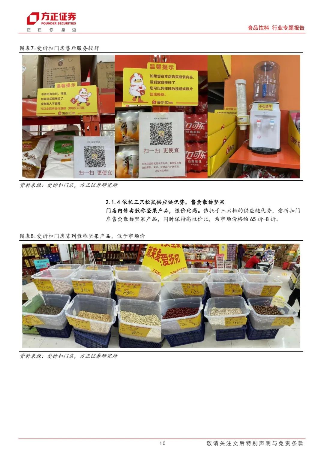 對(duì)比傳統(tǒng)超市,愛(ài)折扣門店陳列及購(gòu)物氛圍差異化顯著。①重視營(yíng)銷宣傳,營(yíng)銷物料強(qiáng)化省錢心智;②店裝修簡(jiǎn)潔,類似山姆的倉(cāng)庫(kù)貨架陳列風(fēng)格,水飲以簡(jiǎn)單割箱陳列或者整箱堆放陳列為主,零食采用專門的愛(ài)折扣陳列箱,降低上貨陳列成本。③注重運(yùn)營(yíng)細(xì)節(jié),顧客服務(wù)意識(shí)強(qiáng),貨架旁設(shè)置有抽紙、濕紙巾、呼叫臺(tái)(有任何問(wèn)題可以按下尋求幫助)等。售后方面退換貨條款寬松。④依托三只松鼠供應(yīng)鏈優(yōu)勢(shì),售賣散稱堅(jiān)果,為市場(chǎng)價(jià)格的65折-8折,性價(jià)比高。