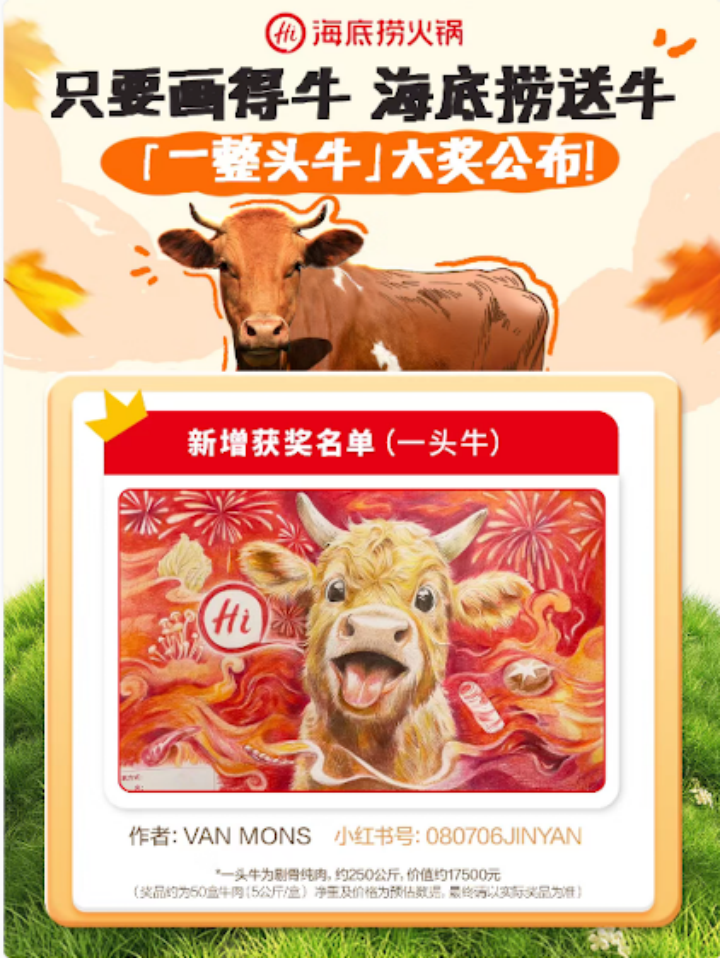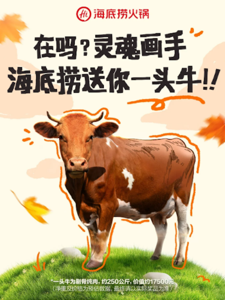 去年9月底,海底撈推出了一個(gè)“畫牛送牛”活動(dòng),顧客來海底撈吃飯就可以領(lǐng)到一張畫紙,在這張紙上畫牛并且把作品交給店里評(píng)選,獲獎(jiǎng)的人有可能得到一整頭牛,不是會(huì)哞哞叫的活牛,而是牛全身的肉,價(jià)值將近兩萬塊錢!