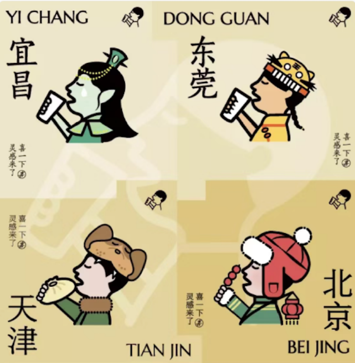 做LOGO營銷事件的基本都是針對(duì)年輕客群的品牌。 除了茶顏悅色之外,喜茶也曾經(jīng)把喝奶茶的小人LOGO跟地域特色結(jié)合起來,推出一整套喜茶x地域周邊產(chǎn)品。