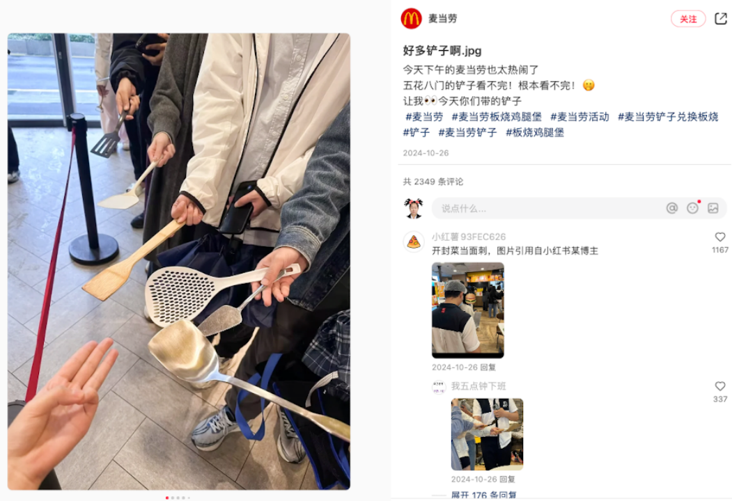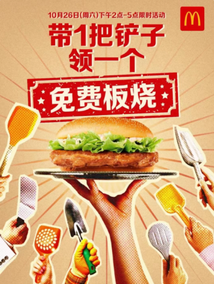 帶鏟子就能領(lǐng)漢堡,太簡單了,比消費(fèi)滿xx元參與抽獎(jiǎng)還要簡單,連錢都不用花;顒(dòng)雖然只持續(xù)三個(gè)小時(shí),但一到開始時(shí)間,全國各地的麥當(dāng)勞就涌現(xiàn)出大量年輕人帶著鏟子打卡拍照。