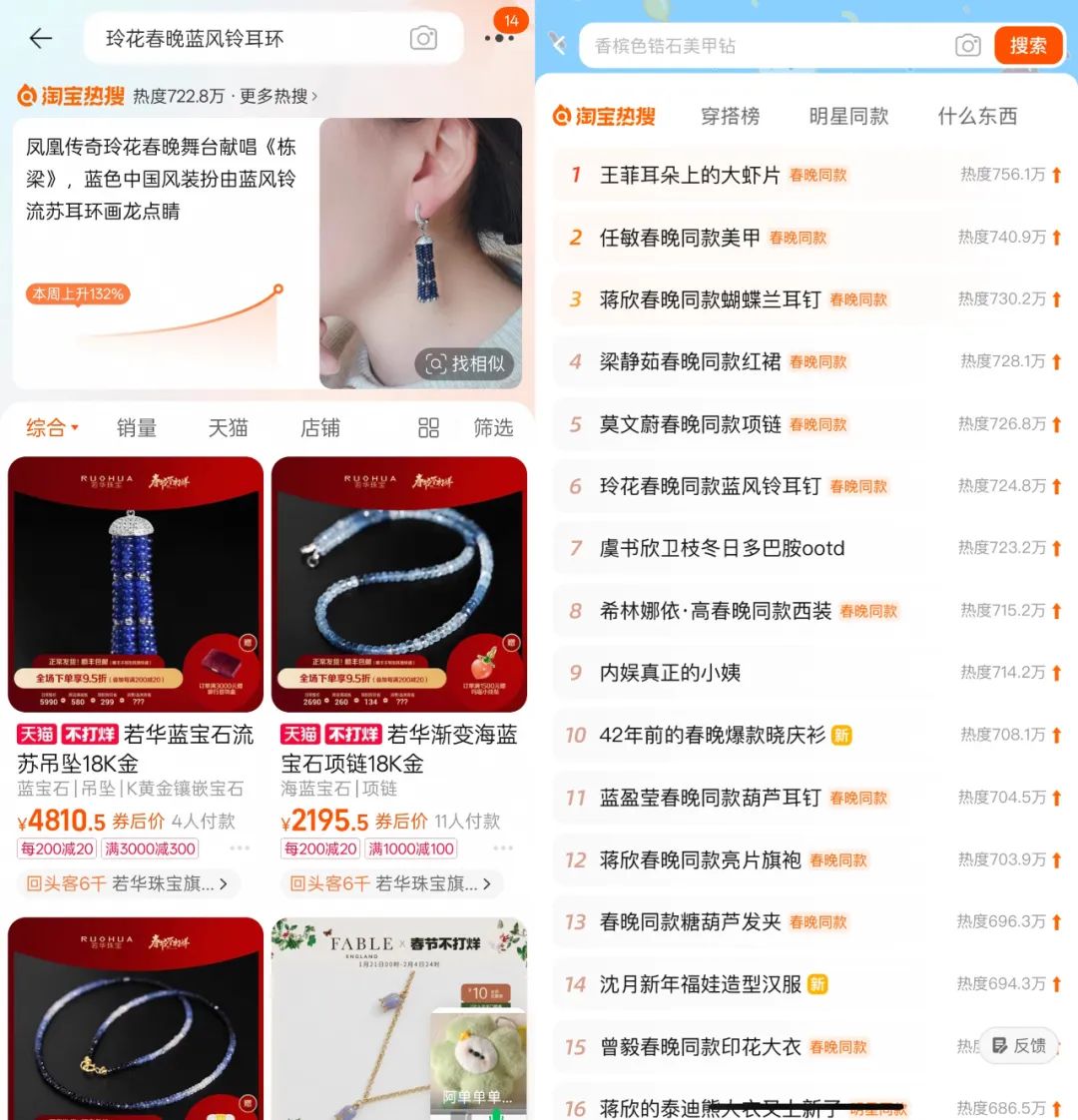 此外,還有藍盈盈佩戴的葫蘆項鏈,馬麗春晚同款蝴蝶戒指,程瀟春晚同款靈芝耳環(huán)都正因春晚出圈,被消費者大量搜索。