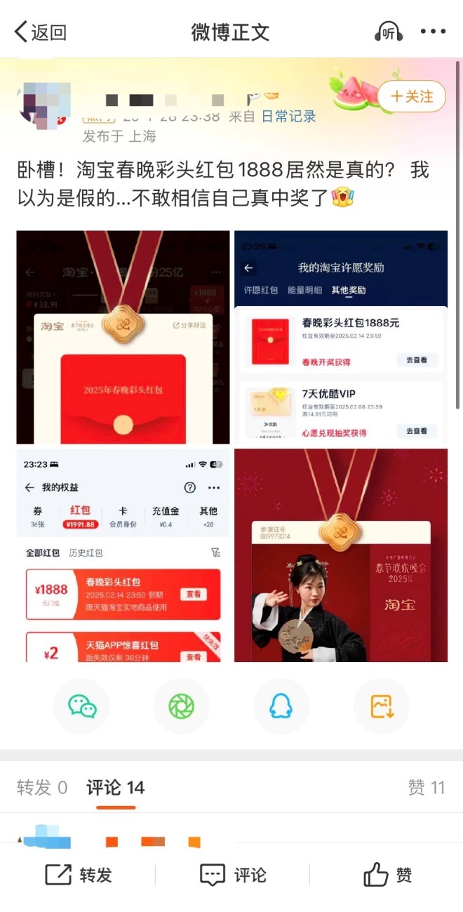 而從除夕當晚開始,微博上已經能刷到不少淘寶春晚紅包中獎88、188甚至1888的分享了。