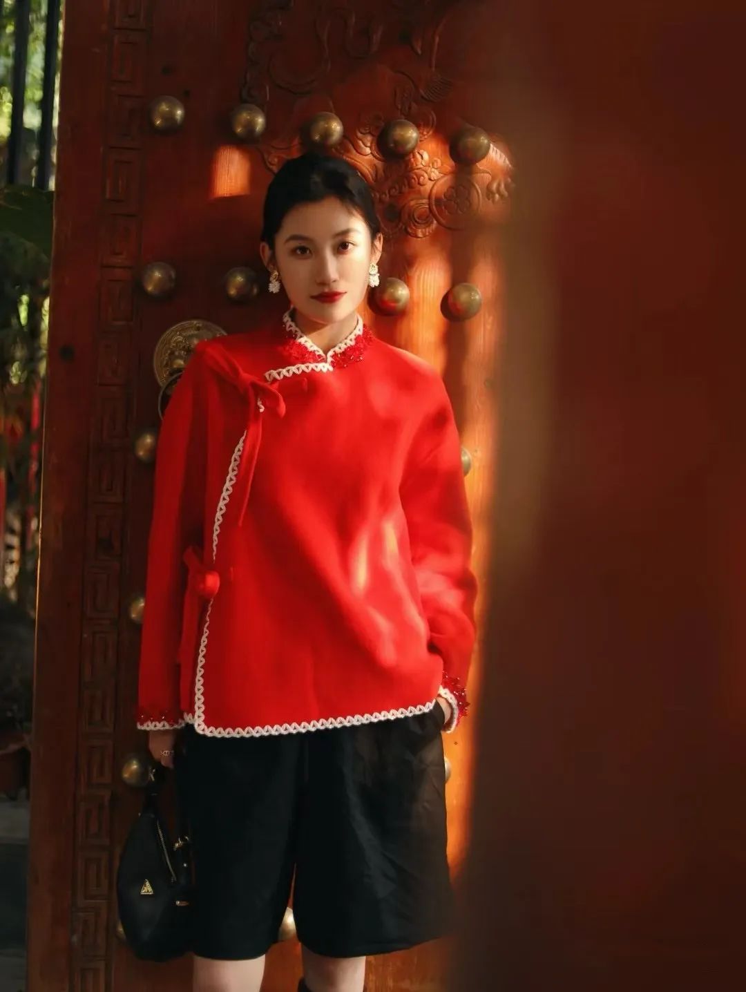 李筱介紹,這款新中式服裝采用的是高飽和正紅色配以白色勾邊設(shè)計(jì),將中國年的氛圍感拉滿,在款式上采用了中式服裝立領(lǐng)及廠字襟的形制,以蝴蝶結(jié)系帶為點(diǎn)綴,十分適合宴會(huì)、出游等日常場景。