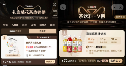 伴隨著越來越多的年輕消費者“上崗”家庭年貨主理人,喜茶也上榜了2025年天貓年貨消費清單。喜茶推出的年貨定制禮盒包裝果汁茶系列,入圍天貓茶飲料V榜TOP5,喜茶真花茶禮盒占據(jù)天貓禮盒裝花茶熱銷榜TOP1,成為年輕人春節(jié)走親訪友、犒勞自己的熱門年貨。
