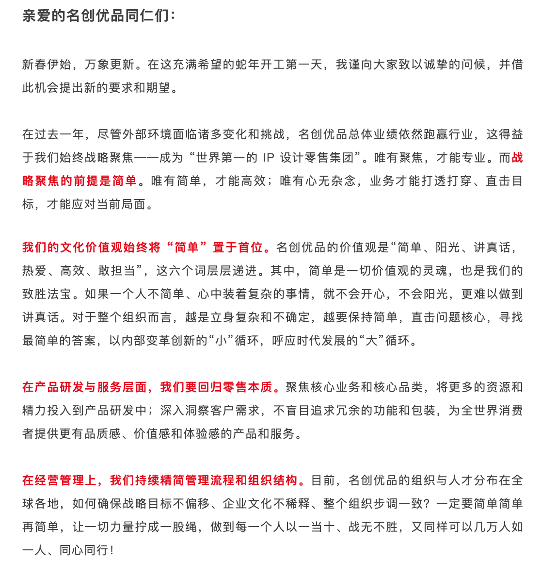 2月5日晚間,名創(chuàng)優(yōu)品集團公眾號發(fā)布《葉國富:讓簡單成為我們的靈魂》推文。文章中,名創(chuàng)優(yōu)品創(chuàng)始人葉國富提出與組織管理相關(guān)的六大要求,以提升管理效率,達到戰(zhàn)略聚焦的目的。