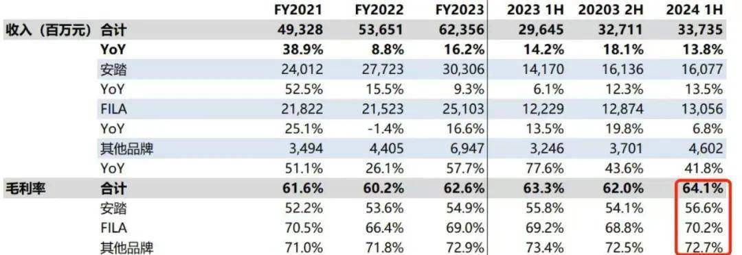 安踏增長的不只有營收,2024年上半年安踏整體毛利率達到64.1%,同比提升0.8%。分品牌來看,安踏主品牌、FILA和所有其他品牌的毛利率分別為56.6%、70.2%和72.7%。